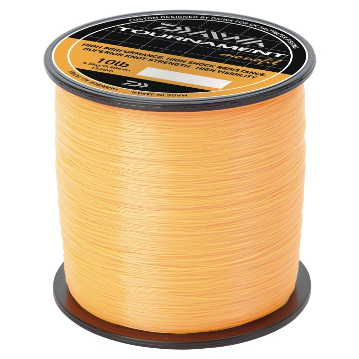Daiwa Tournament fluorescent Monofil, Tournament fluorescent monofil was designed especially for sea anglers and tournament casters. Now available in yellow and orange the extreme durability and excellent breaking strain to diameter ratio remain. Despite the regular action of casting and retrieve it maintains its smooth surface ensuring consistent line travel throughout its life.