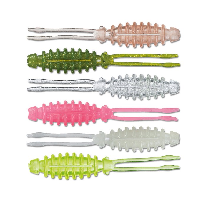 A Daiwa Twin Beam Lure is two inches long and is shaped to suggest a little shrimp or squid. The favourite food sources of predator saltwater fish. Their fat body with ribs and two long arms create irregular movements reacting to water current and rod actions. The Daiwa Twin Beam Lure is very soft and tear resistant. When used on a jig head, ideal for imitating a shrimp that jumps swims and crawls on the bottom. When used in a Carolina rig or with a light jig head and drifting in water, it is suggestive of little squid. Also works in perfect combination with Tsukino Kabura. The glow patterns are illuminous, enhancing the lures visibility. Daiwa Twin Beam Lures are impregnated with Amino acid fishing formula. The two arms with a tumor on tip create vibrations creating fluctuation of water when shaken and work as stabilizers when lure is sinking down. Slits on both back and belly for proper setting of a hook.