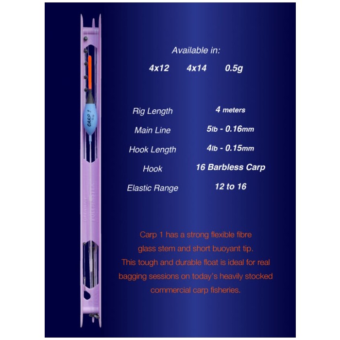 The Drennan Carp 1 ready-made carp pole rig is the ideal all-rounder. It comes tied to 4m of 5lb line with a 4lb hook length and size 16 barbless carp hook, and can be used with a range of baits on any carp venue.