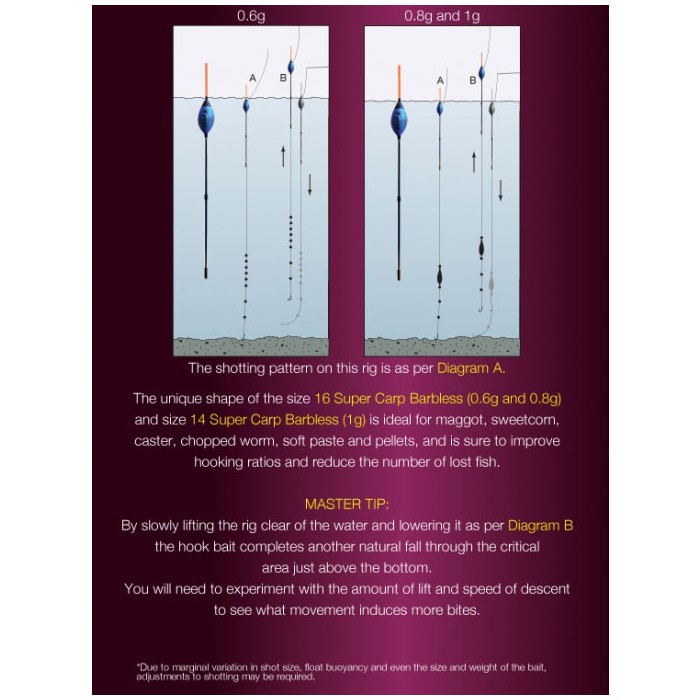 The 0.4g size is tied to 4m of 6lb mainline with a 5lb hook length and an 18 super carp barbless hook. The 0.6g and 0.8g sizes are tied to 4m of 6lb mainline with a 5lb hook length and a 16 super carp barbless hook. The 1g rig is made up using a size 14 super carp barbless hook tied to 4m of 6lb mainline and 5lb hook length.