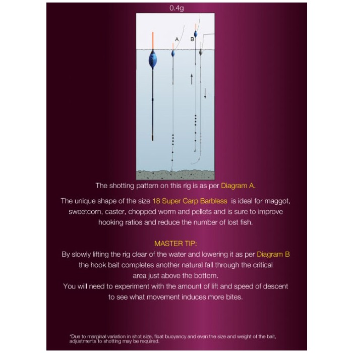 The 0.4g size is tied to 4m of 6lb mainline with a 5lb hook length and an 18 super carp barbless hook. The 0.6g and 0.8g sizes are tied to 4m of 6lb mainline with a 5lb hook length and a 16 super carp barbless hook. The 1g rig is made up using a size 14 super carp barbless hook tied to 4m of 6lb mainline and 5lb hook length.