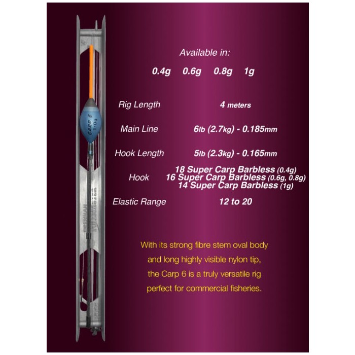 With its strong fibre stem, oval body and long, highly visible nylon tip, the carp 6 is a truly versatile rig perfect for commercial carp fisheries. The unique shape of the size 18 super carp barbless is ideal for maggot, sweetcorn, caster, chopped worm and pellets and is sure to improve hooking ratios and reduce the number of lost fish.