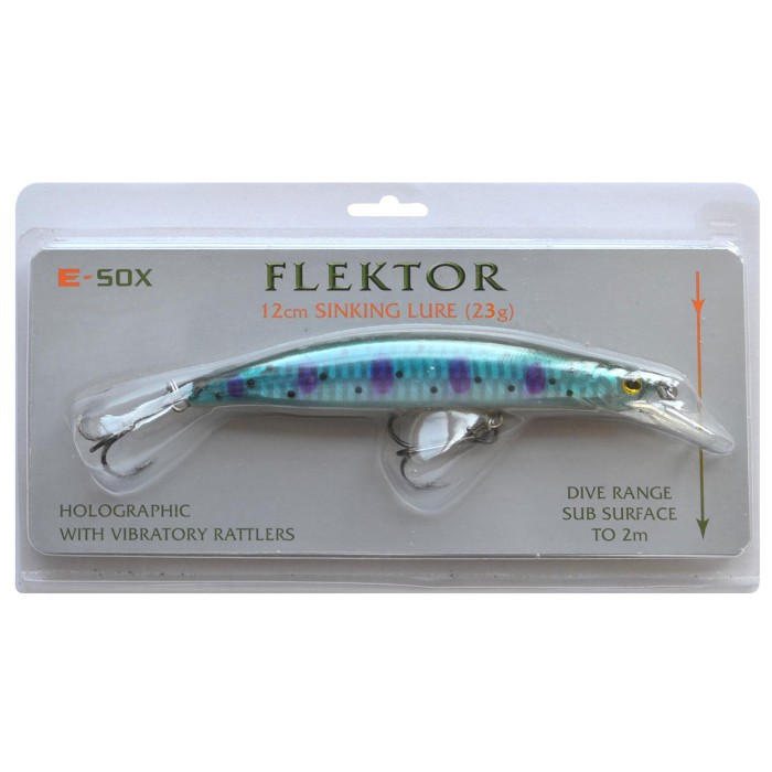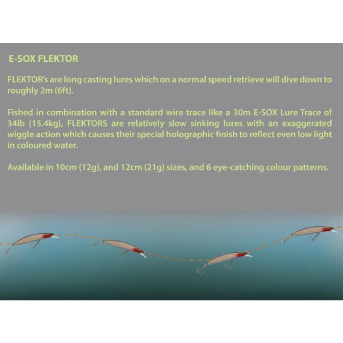 Flektors are long casting lures which on a normal speed retrieve will dive down to roughly 2m / 6ft. Fished in combination with a standard wire trace like a 30m E-Sox Lure Trace of 34lb / 15.4kg, Flektors are relatively slow sinking lures with an exaggerated wiggle action which causes their special holographic finish to reflect even low light in coloured water. Available in 10cm / 12g, and 12cm / 21g sizes, and 6eye-catching colour patterns.