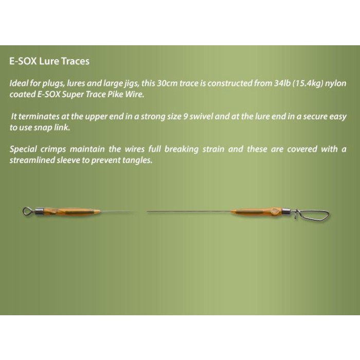 Constructed from nylon coated E-SOX Super Trace Pike Wire, this lure trace ends at the upper end in a strong size 9 swivel and at the lure end there is a secure easy to use snap for easy adding and removing from your braid or line.