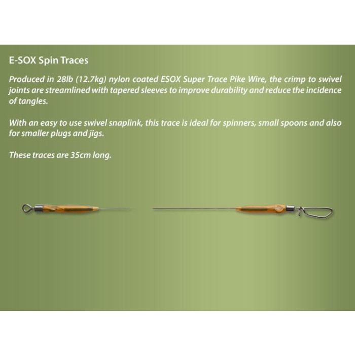 Produced in 28lb (12.7kg) nylon coated ESOX Super Trace Pike Wire, the crimp to swivel joints are streamlined with tapered sleeves to improve durability and reduce the incidence of tangles.