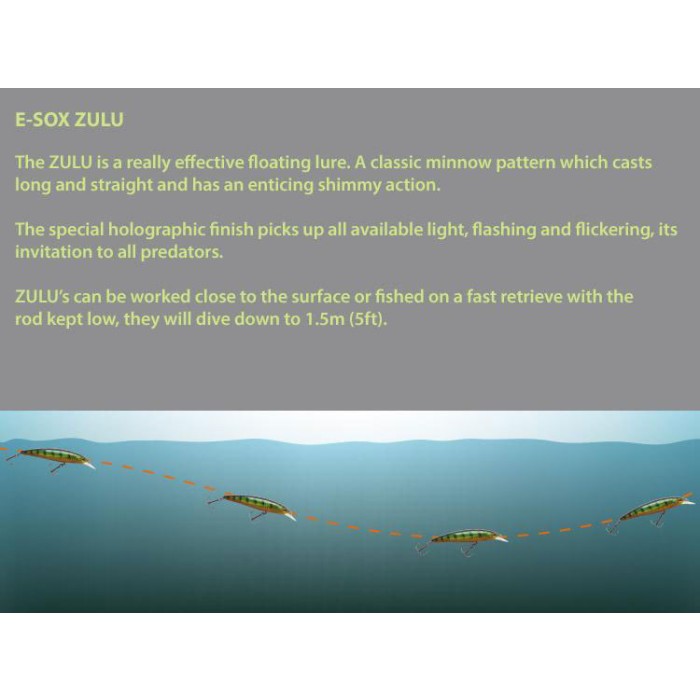 The Zulu is a really effective floating lure. A classic minnow pattern which casts long and straight and has an enticing shimmy action. The special holographic finish picks up all available light, flashing and flickering, its invitation to all predators. Zulu's can be worked close to the surface or fished on a fast retrieve with the rod kept low, they will dive down to 1.5m / 5ft.