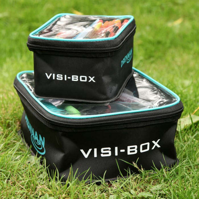 Drennan EVA Visi-Box, The Drennan Visi-Box is a really practical storage solution for all manner of accessories, baits and other fishing items. The two sizes are both made from semi-rigid EVA material which is robust, yet lightweight and durable. It is also waterproof and really easy to wipe clean. A clear, zip-up lid also allows you to easily see whats inside. The Small Visi-Box (22 x 14.5 x 9cm) has a 2.5-litre capacity. The Large Visi-Box (29 x 21.5 x 10cm) has a 6-litre capacity.