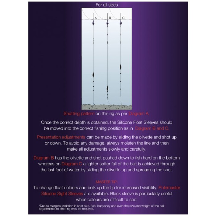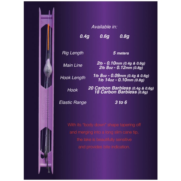 These 'ready to go' pole fishing rigs are, as the name suggests, ideal on lakes. They will also work well on any still or slow flowing water. With its "body down" shape tapering off and merging into a long, slim cane tip, this float is beautifully sensitive and provides excellent bite indication. It offers excellent stability in choppy conditions on deep stillwaters.
