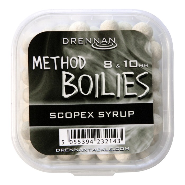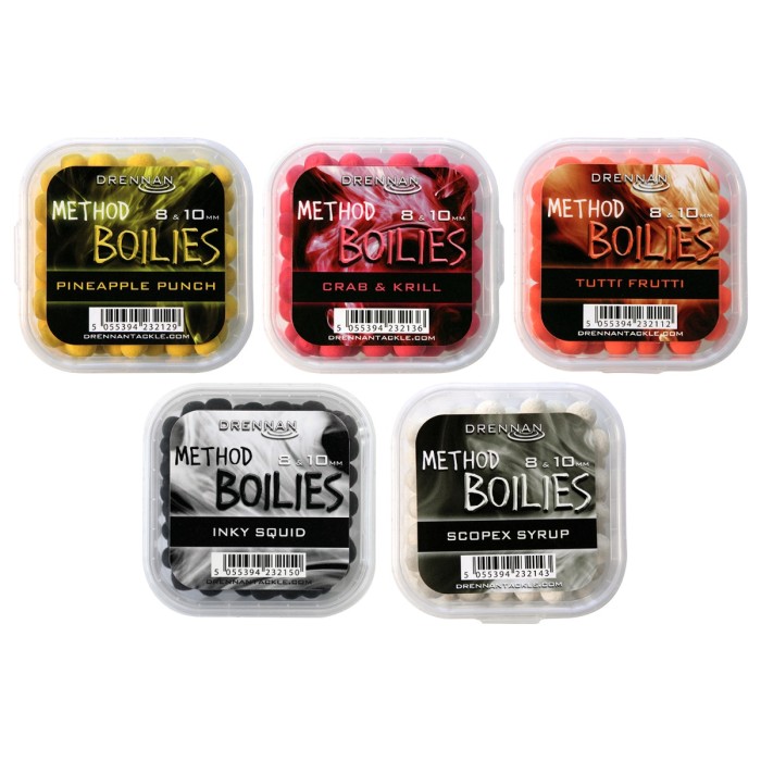 Drennan Method Boilies are highly visible with proven flavour combinations, including white Scopex Syrup, pink Crab & Krill, yellow Pineapple Punch and orange Tutti Frutti. New for 2016 are our extra special black Inky Squid Method Boilies.