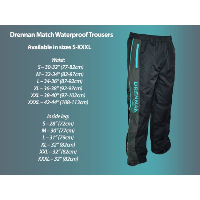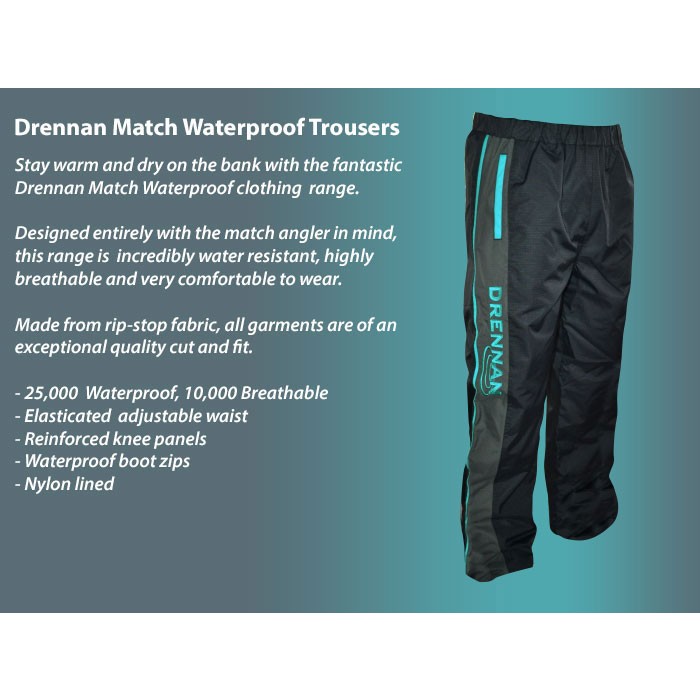 Stay warm and dry on the bank with the fantastic Drennan Match Waterproof clothing range. Designed entirely with the match angler in mind, this range is incredibly water resistant, highly breathable and very comfortable to wear. Made from rip-stop fabric, all garments are of an exceptional quality cut and fit.