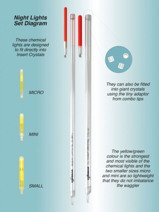 These Drennan Night Lights have been purpose designed for use with the Drennan Insert Crystal Wagglers. These are some of the most popular wagglers available on the market today and these Night Lights ensure that you can maximise their potential on the water. To use, simply crack and mix the lights as described above. Once they are glowing brightly, you can then unscrew the tip from your Drennan Insert Crystal Waggler. Thanks to the transluscent stem of the waggler, once you insert your Night Light you’ll be able to see its glow clearly, even from a distance. You can then reattach the top of the waggler and rig up as normal – your glowing waggler is ready for use!