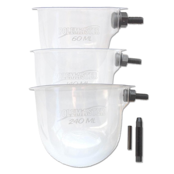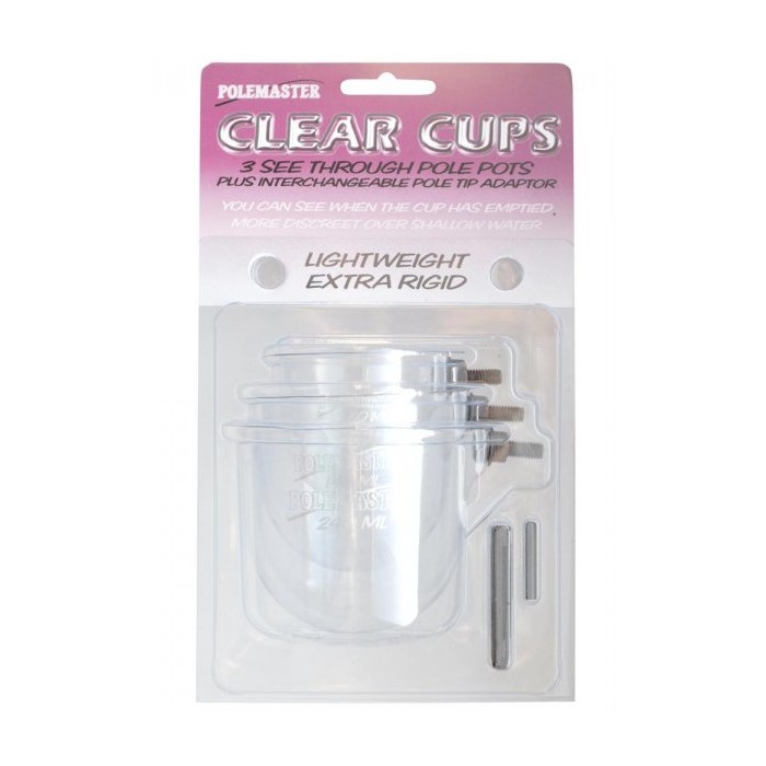 A set of 3 various sized (60ml, 140ml, 240ml) clear pole cups with adaptor, easy to see when empty and less conspicuous over shallow water.