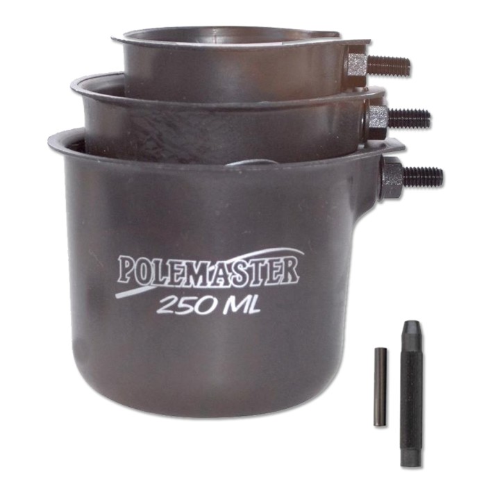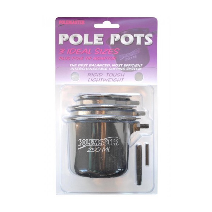 Drennan Polemaster pole pots plus pole tip adaptor in three ideal sizes. The best balanced most efficient interchangeable cupping system.
