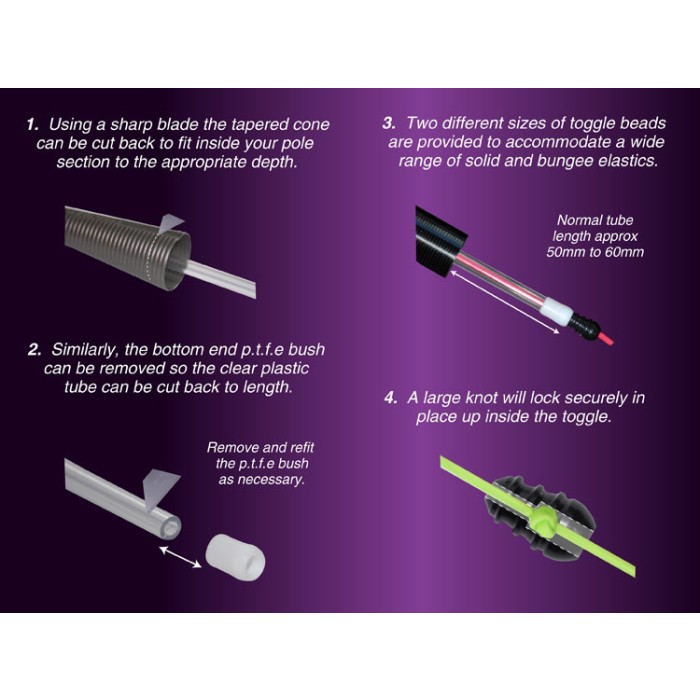 Drennan Polemaster Pull Bung, After lengthy development Drennan launched the Drennan Polemaster Pullbung at the very end of 2011 a tackle item which has really grown in popularity at Commercial Puddle type venues in recent years. The purpose of the Pullbung is to allow the pole angler to effectively set the chosen elastic soft to fish for both small silverfish & small carp without fear of bumping them. However, if a much larger fish is encountered the angler can ship back to the relevant section containing the Pull Bung and gradually start to pull elastic out of the tube with his free hand usually securing this with the fingers of the hand holding the top kit. This effectively tightens the elastic, gradually exerting more pressure on the fish, and enables the angler to successfully land it without the need for playing a fish for an abnormally long time and then having to try and net it with a long length of pole in the air (potentially risking an expensive carbon breakage !) and lots of elastic stretched out. The Pullbung is made in a relatively pliable plastic so that it is easy to cut without splitting or cracking. It also comes complete with super slick internal bushes top and bottom to reduce wear and protect the elastic and is probably best used with a strong carp type pole i.e. one designed to be used with more powerful elastics.