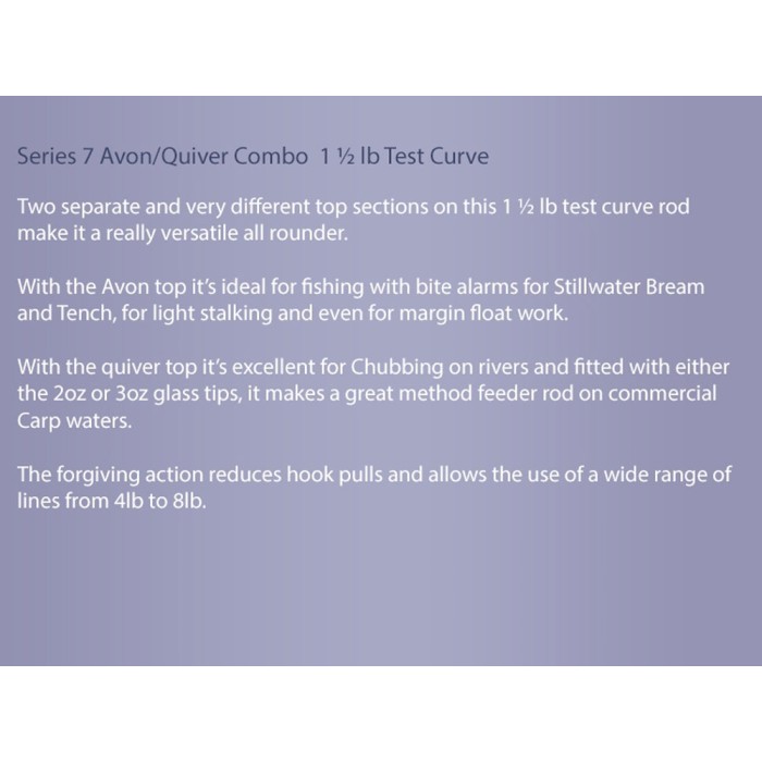 This multi-purpose 12ft (3.66m) Specialist Avon Quiver Combo is a great all rounder with a 1.25lb test curve and two entirely separate top joint systems.