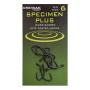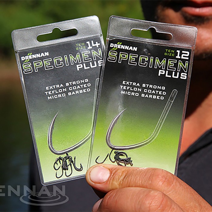 Drennan Specimen Plus Hook, Designed specifically for the big fish specialist angler, they have an unusual drop angle bend which is a mechanically strong shape. The heavy gauge steel wire has been high pressure flat forged around the bend to further strengthen this already reliable pattern and long curved point is not only excellent at hooking and holding but is also less inclined to damage or blunt when fishing over gravel.