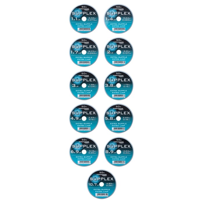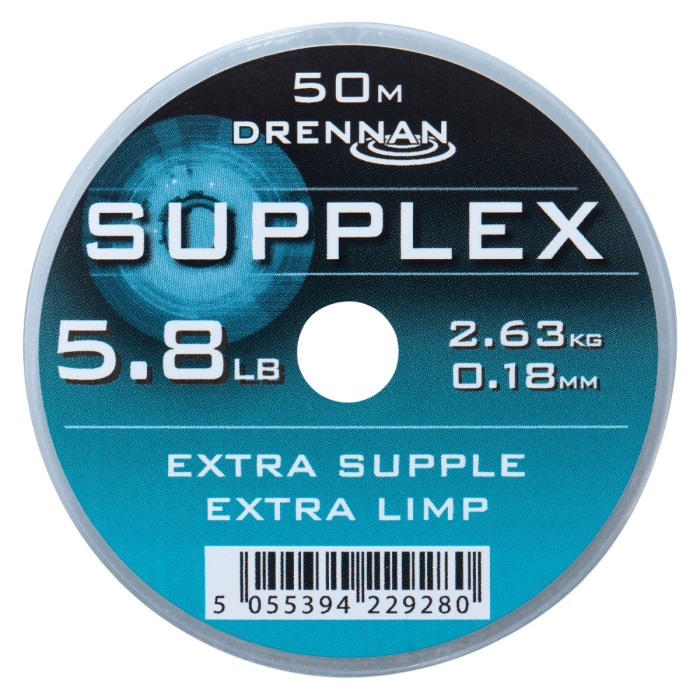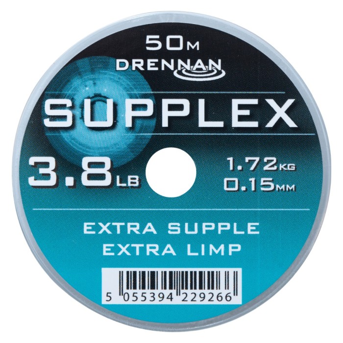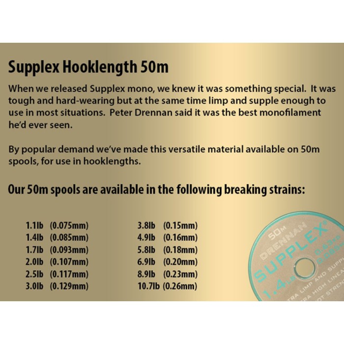 Drennan Supplex Hooklength, Following the success of the Supplex mainline, Drennan now offer handy 50m spools of hooklength or rig line. Not just the mainline re-spooled, the hooklength line has slightly different characteristics. It is ultra limp and supple, has virtually no memory and offers ultra high linear and knot strength.