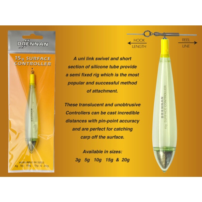 Drennans clear plastic surface controllers are best used by locking them onto the line with Drennan leger stops. They are ideal for all types of floater fishing, particularly when presenting a floating bait to wary carp. They are often used with a greased, floating hooklength.