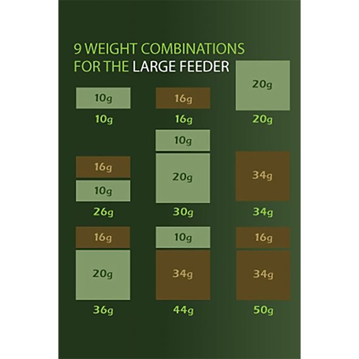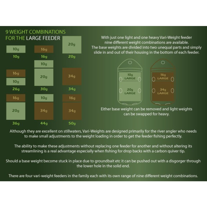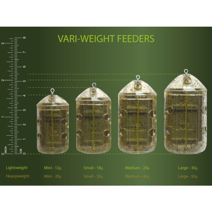 There are four Vari-Weight feeder packs in the family, each with its own range of nine different weight combinations: Mini, Small, Medium, Large.