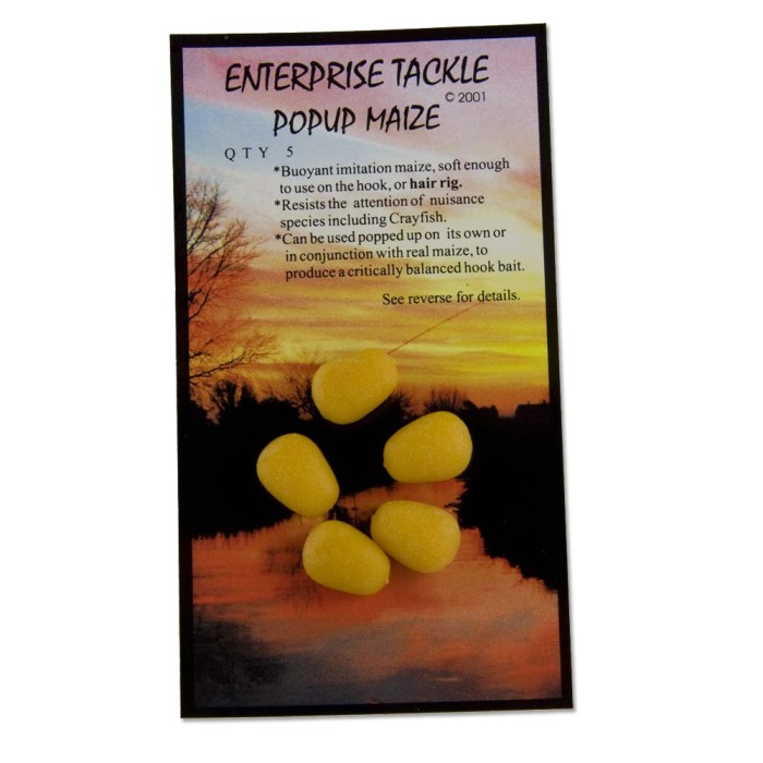 Popup maize is best fished on a hair rig over a bed of real maize /corn and pellet.It can be used popped up on it's own or in conjunction with real maize, to produce a critically balanced hook bait.