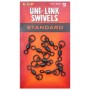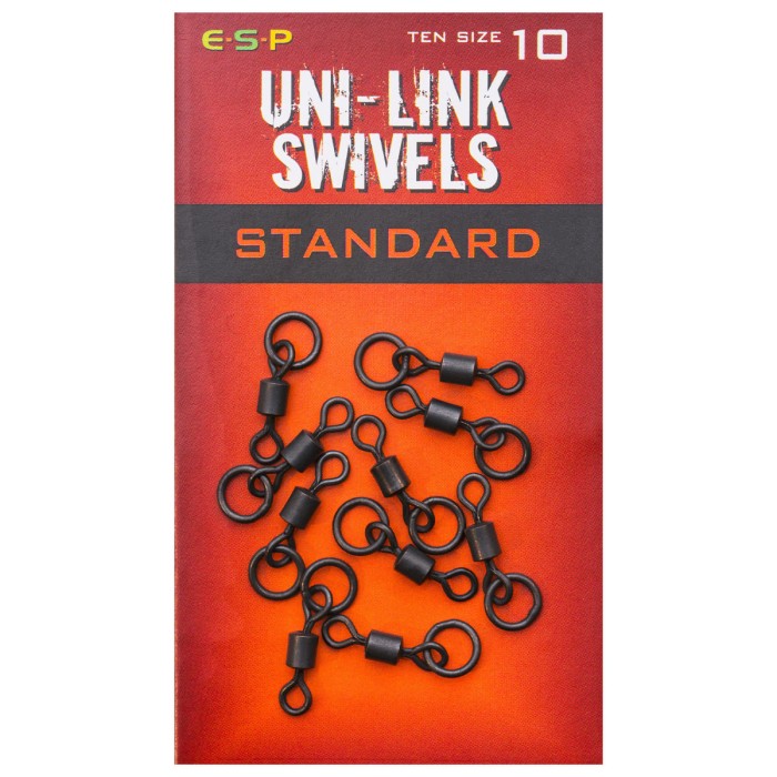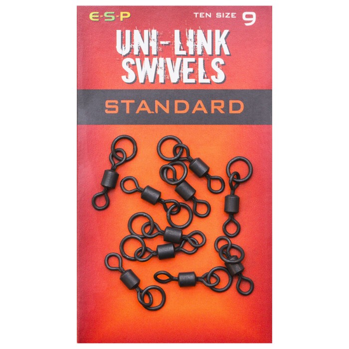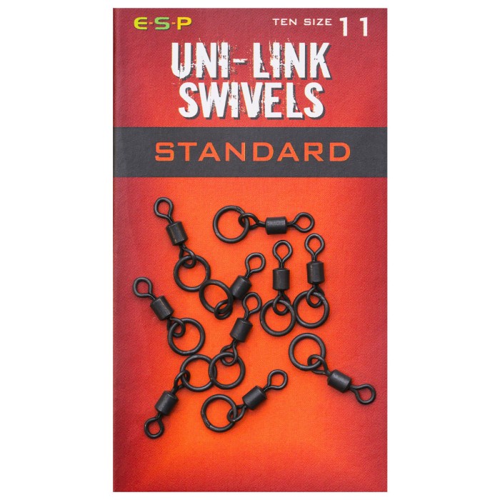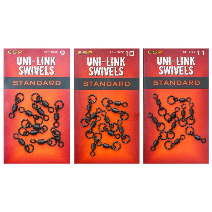 ESP Standard Uni Link Swivels provide a universal hinge and 360 degree movement to otherwise rigid hook links and are ideal for stiff mono rigs and Combi Rigs in coated braid. They also improve the presentation of lighter, more flexible mono and soft braided hook links, effectively reducing tangles on the cast. Packets of 10. Available in sizes 9, 10 and 11 to fit all popular safety clips and in line leads.