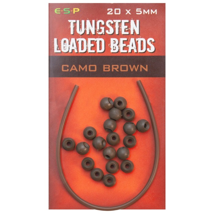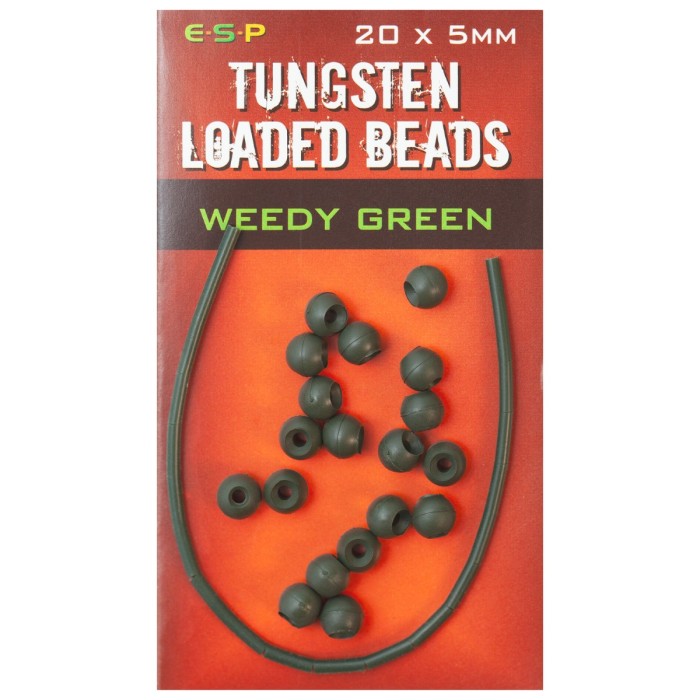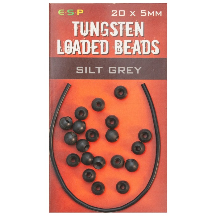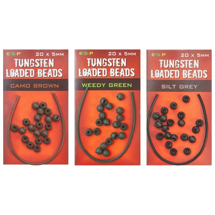 ESP Tungsten Loaded Beads, The trusty old ESP 5mm rubber beads have been a staple component for helicopter and chod set ups on leadcore since 1999 and now they have been given the heavyweight tungsten treatment with the introduction of Tungsten Loaded beads. These are four times heavier than the rubber versions (the difference is really noticeable) while still remaining soft and flexible. The three matt colours of weedy green, camo brown and silt grey complement the different ESP leadcore colours perfectly. Designed to be mounted on leadcore on a short section of 0.5mm silicone tube which is supplied with the beads. This provides a safe set up where the bead can come off the silicone tube and pass over the leader knot in the event of a break-off, releasing the hook link. Each packet contains 20 beads and a length of 0.5mm silicone tube, available in weedy green, camo brown and silt grey.