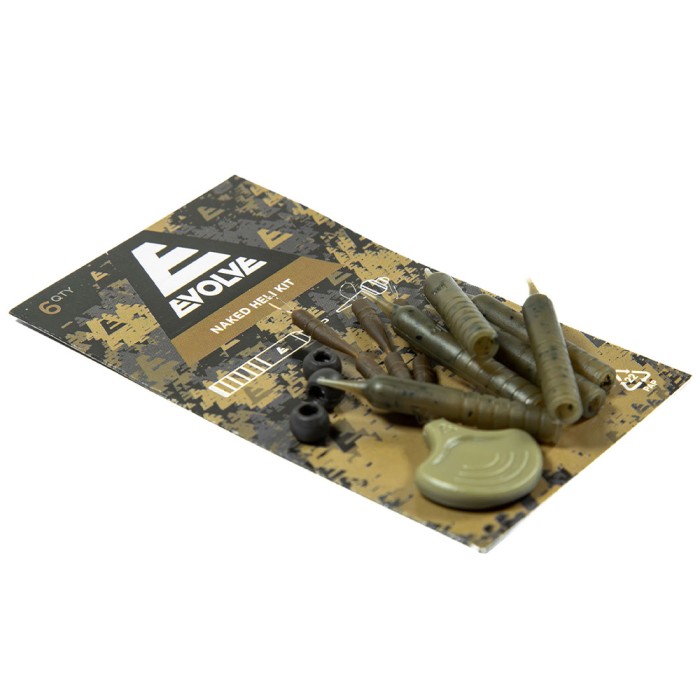 Evolve Tackle Naked Heli Kit, The Evolve Naked Heli Kit is for use with helicopter and chod rigs on mainlines. Three release fittings, so bead release can be tuned to the size of weight being used. Long tapered base for smooth flow of the swivel over the sleeve. Tapered top to encourage the swivel pass back over the sleeve. Sleeves moulded in the Evolve translucent dark camo colour for enhanced rig concealment. Beads moulded in tungsten rubber. Sleeves supplied on an ergonomic fob and wires for ease of use. Minimal size naked buffer sleeve for an unobtrusive and adjustable set-up. Buffer Sleeves moulded in the Evolve translucent dark camo finish for optimum rig concealment.