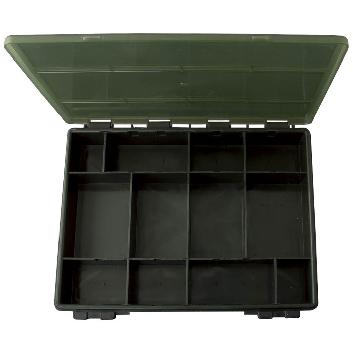 The tackle box itself is a classic carpy green colour, so it will look great with the rest of your carp fishing tackle, and it’s manufactured from heavy-duty plastic that has been designed to withstand the usual rigours of carp angling. The clips that fasten the box are simple to use and break-resistant, so you won’t find yourself having to fumble on the bank to gain access to your gear or open your luggage to find the box has spilt your terminal tackle all over the place in transit.