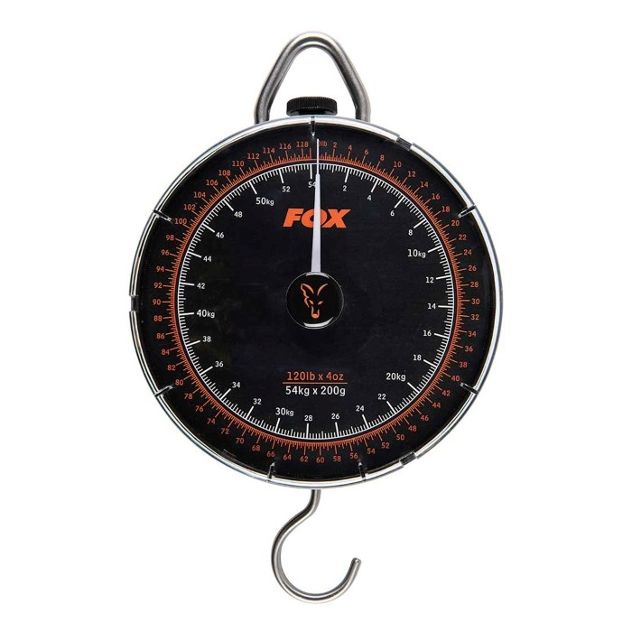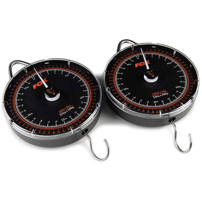 The Fox Dial Scales - 60lb / 27kg Weighs in both kg and lbs. Two versions 60lb (27kg) and 120lb (54kg). 60lb (27kg) weighs in 2oz and 100g increments. 120lb (54kg) weight in 4oz and 200g increments. Single revolution. Stainless Steel hook and hanging point.