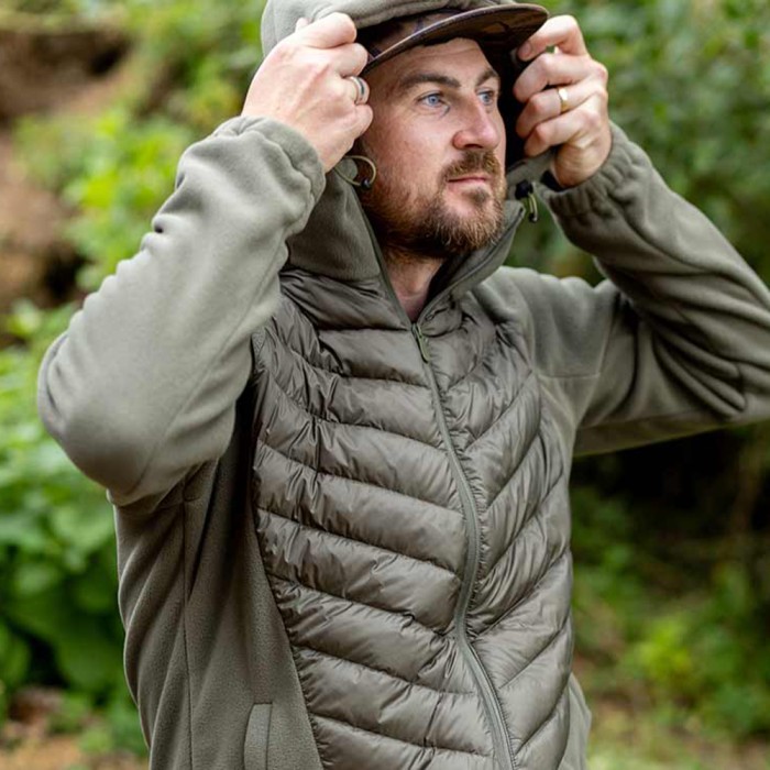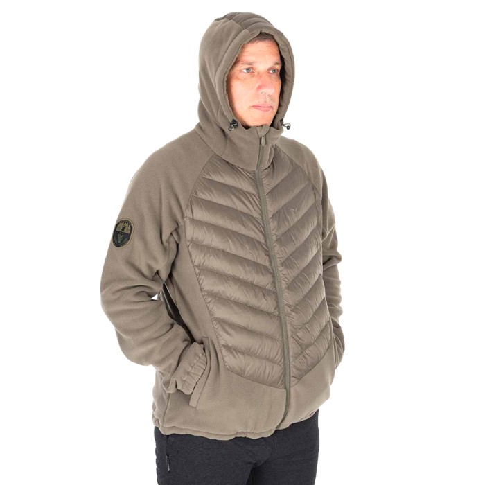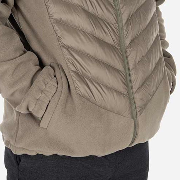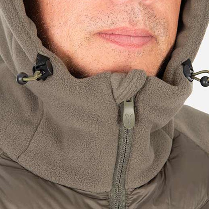 90/10 duck down fill main body. Comfortable fleece sleeves and hood.