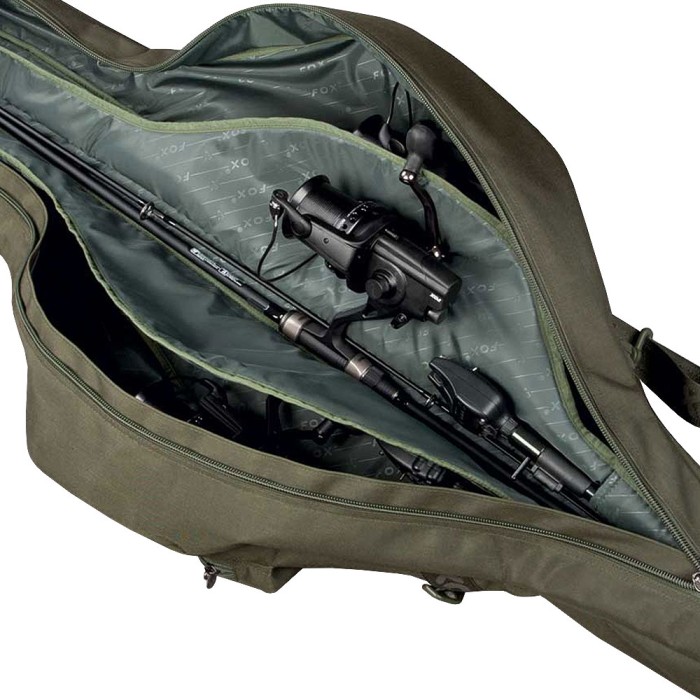 Hard wearing CORDURA fabric (100% Polyester). Heavy duty zips. Reversible 3D padded shoulder strap. 2x padded dividers keep rods separate and protected. Base of padded dividers. Retaining pockets for banksticks and buzzers. Stiffened EVA grab handles. External zipped lead retaining pocket. Essential tools and accessories pocket. Rig pocket with EVA rig board. Sized to accommodate rods with 50mm butt rings and big pit reels. Landing net pocket on exterior.