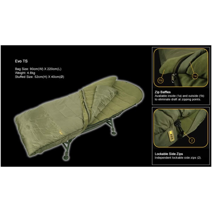 Fox Evo TS Sleeping Bag comes with a removable and reversible floating blanket to add extra warmth in severe weather. The blanket has a fleece lining on one side and a polyester lining on the other, allowing you to reverse the fleece depending on your preference for the feel of either material. This blanket can be fixed internally with the use of toggles, or loose for on the top or underneath use.