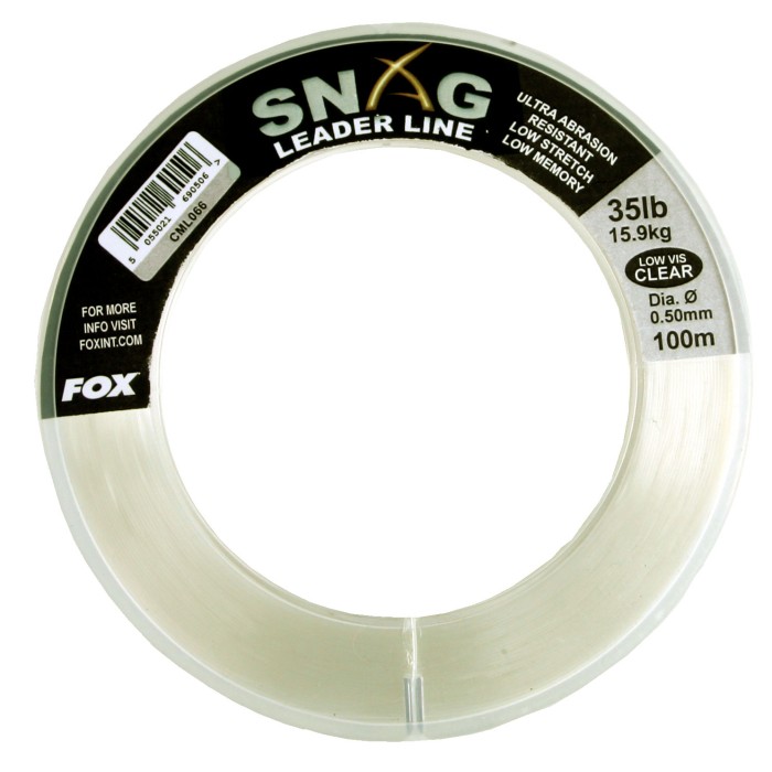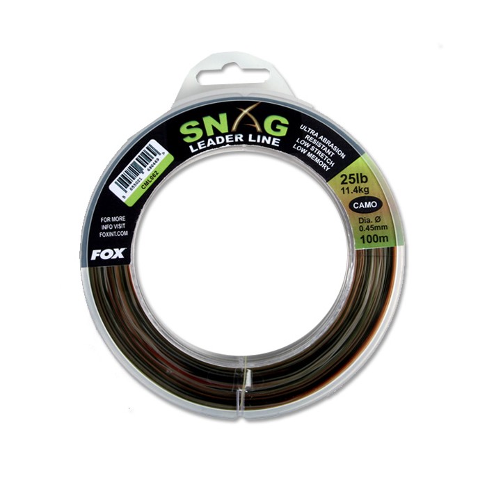 Fox Snag Leader Line, Available in either camo or clear, this snag leader has ultra abrasion resistance, low stretch and low memory.