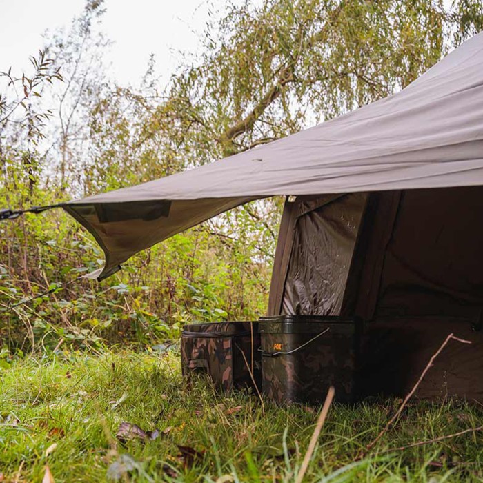 The Fox Voyager Tarp - Small is an ultra lightweight Fishing Shelter that can be set up in multiple different arrangements giving you the flexibility to adapt to any Carp Fishing Situation. This tarp includes two 4-part poles that allow for multiple height settings, allowing you create the perfect shelter no matter your environment. The, four retaining bolts make it easy to use extra storm poles for added stability in windier weather conditions.