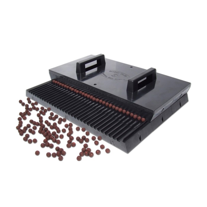 The Rolaball Baitmaster offers much greater bait making capacity as the wider design simply rolls more boilies at a stroke than our longbase tables. This makes bait making much quicker and more efficient – and this means that anglers that want the control or economy of making their own bait can make sufficient quantities of bait in a shorter time. We supply a large number of bait making companies with these tables, most of whom are rolling really large quantities of bait every day. One of the key reasons they choose the Gardner rolling tables is because they don’t wear out as quickly like cheaper copies – all our tables are only moulded from top quality, high impact virgin ABS plastic for a long working life. Other large tables that are available are made from brittle material so they break or crack far too easily (and they’re expensive too)… With a little practice you can produce about 50 baits at a stroke, perfectly formed and exactly to your specification. Be sure to use the correct size sausage made from either a Rolling Table or a Sausage Gun. The top section of the Rolaball Baitmaster is fitted with a pair of Easi-Grip handles, and the base can be screw fixed onto a board or work surface to keep it straight and safe when not in use (recommended).