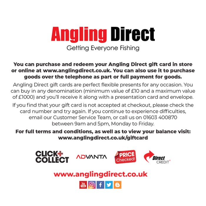 Angling Direct gift cards are perfect flexible presents for any occasion. You can buy it in any denomination within minimum value of £10 and a maximum value of £1000. Our gift cards can be redeemed at any time online at the anglingdirect.co.uk website or in your local Angling Direct Tackle shop. It can also be used to place an order over the telephone as a part or full payment. You can use your gift card multiple times with different orders. For full terms and conditions please visit... Gift Card terms and conditions. To check your current balance please visit... Gift Card balance check.