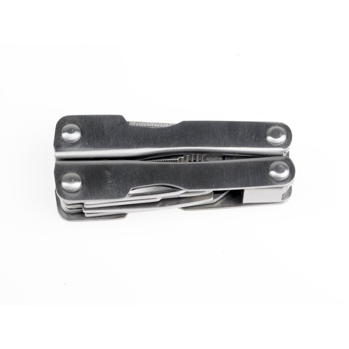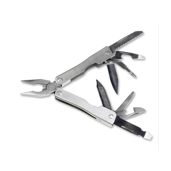 • Includes pliers, cutter, wire strippers, 3 flat head screwdrivers, 1 Phillips screwdriver, knife blade, saw blade, tin and bottle openers, two files and a punch