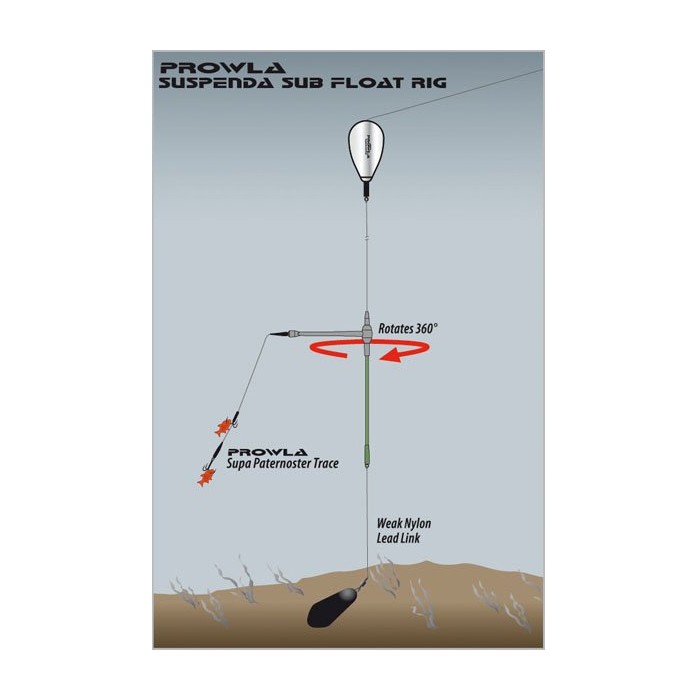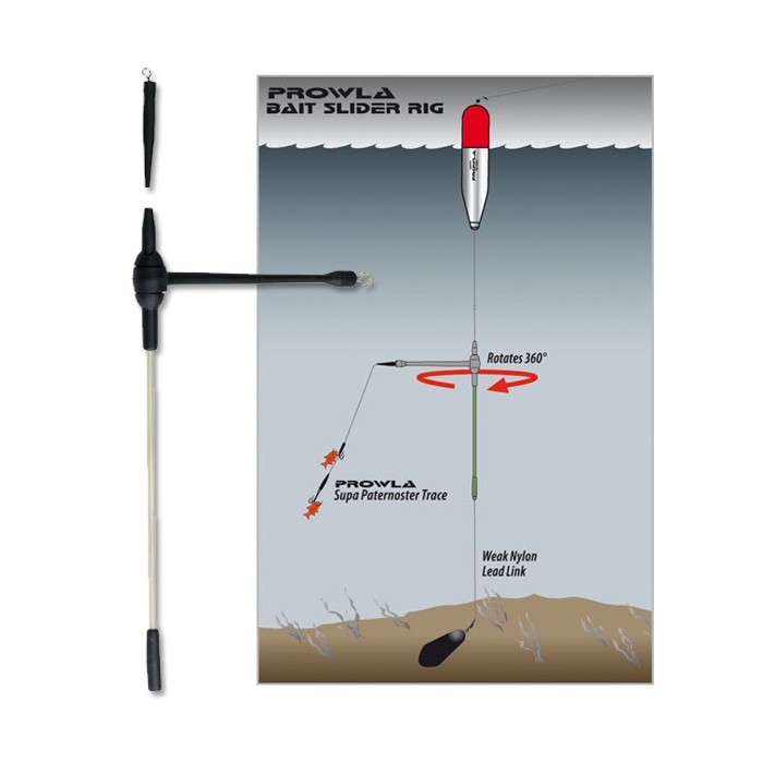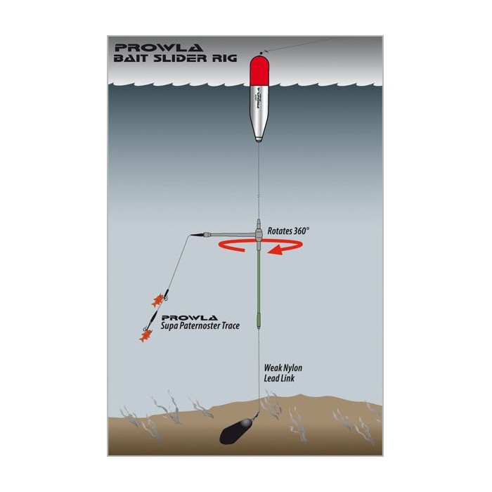 Used with a Prowla Suspenda Sub Float fixed to the top swivel of the uptrace mono, the rig can be fished at any depth by adjusting the length of the weak nylon lead link. Alternatively it can be used with a standard style Prowla Bait Slider with the fishing depth being set by using a sliding stop knot and bead. Attach a Prowla Supa Paternoster trace to the boom arm swivel, which is moulded inside and along the full length of the arm and around the 360 rotary head for extra sure fish-safe security.