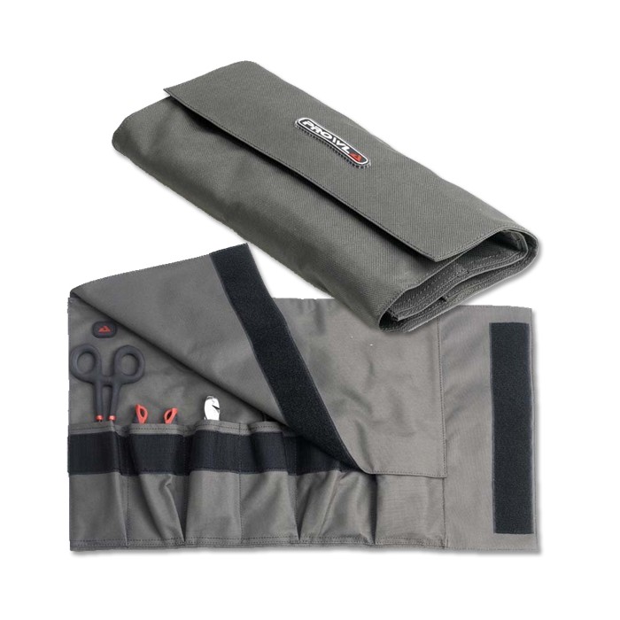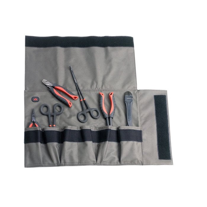 This Prowla tool roll is specifically designed to hold all 6 individual tools in the range. The 2 largest internal pockets will comfortably hold the Prowla long nosed pliers and extra long side cutters, whilst the 4 smaller pockets hold the Prowla crimping and split ring tools, plus the Prowla 10" straight and curved forceps. If you want to keep wire blades in the tool roll there is ample space in any of the 6 divisions.