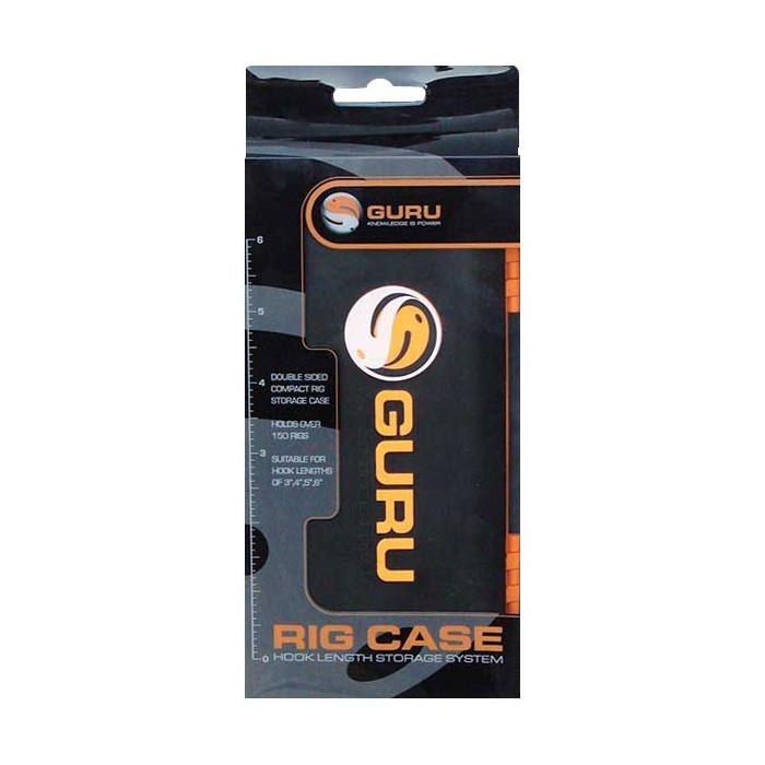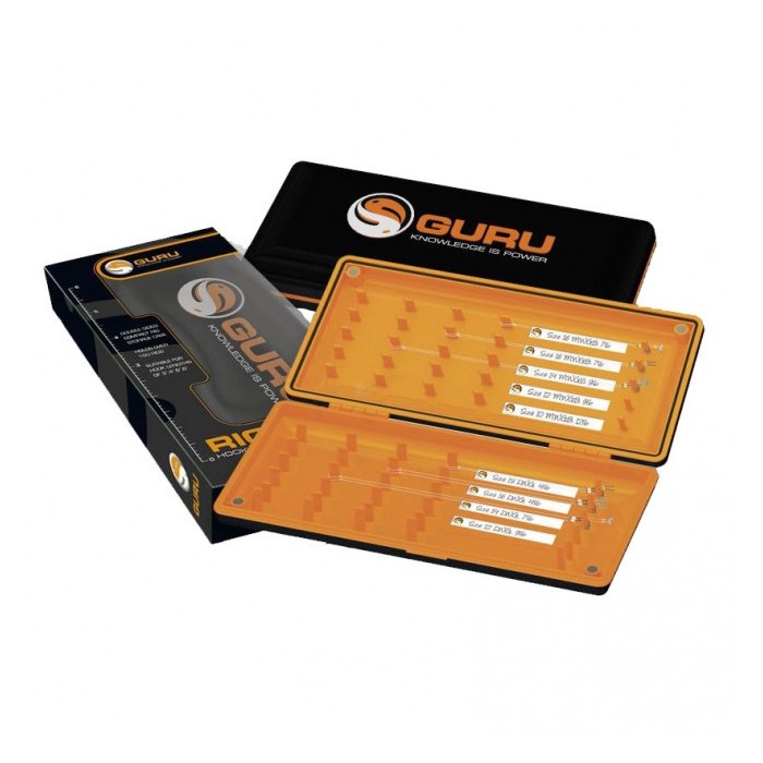 Rig storage system specificity designed for match and coarse angler. The GURU Brand Manager Adam Rooney and head consultant Steve Ringer both have used existing rig cases and felt that they werent quite up to scratch, so the Guru design team set about designing one from scratch and here is the final result. Firstly, the team increased the length of the retention pegs, and made the case double-sided. The case features a unique magnetic fastening system, which ensures that your tied rigs are protected when in transit. The case has been designed to be totally water resistant by including a rubber seal on in the top lip of the case that is inserted to receive the internal raised lip of the lower section when closed. This creates a water tight seal, which will keep the British weather at bay while youre out on the bank, fully protecting your precious rigs inside. Finished in GURU colours; black on the outside and orange on the inside and the whole thing is coated with a soft-touch over-mould, to produce finished product that will be easy to handle even on the coldest and wettest of days.