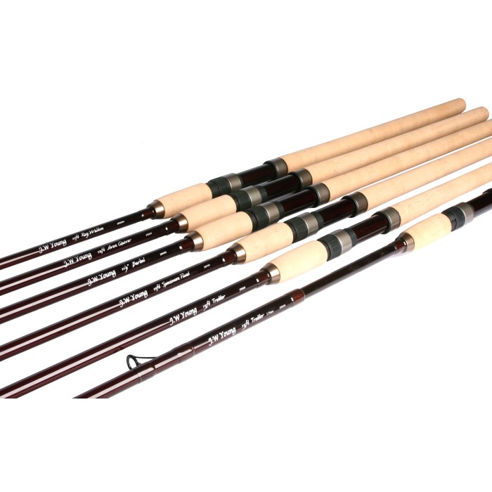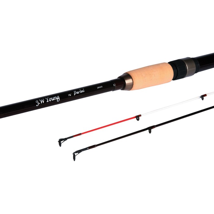 The J W Young 12 Barbel rod is a specialist big barbel rod consisting of a butt and two top sections. The standard tip has a 2lb test curve and the spliced in quiver tip has a 3oz test curve. With either tip the rod is recommended for use with lines between 7lb and 14lb.