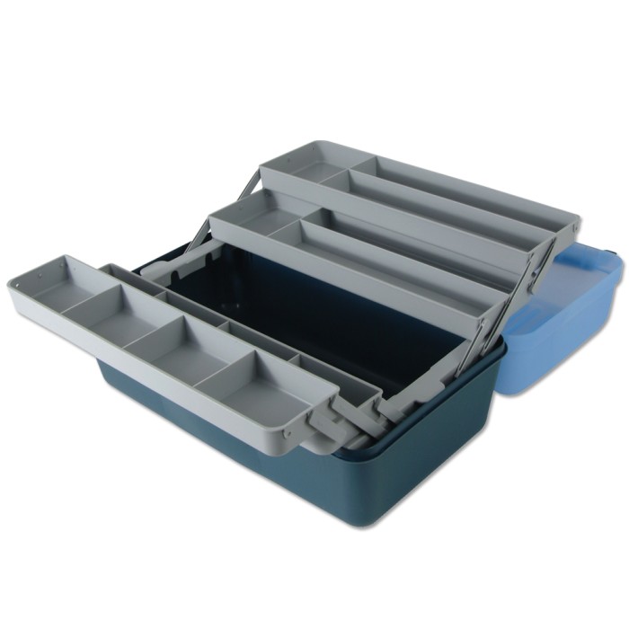 The box features two cantilever trays, which are divided into sections, and a large main compartment, the box also features a carry handle.