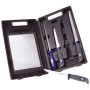 This great kit comes complete with three knives and a sharpening steel. Each of the knives has a super-comfortable bi-moulded soft grip and "Razor" sharp stainless blade. The blade of the 5" knife is double sided with a scaler on one side and a sharp toothed blade purpose designed to make short work of bones. The 6" and 8" fillet knives have narrow blades with sufficient spring in them to ensure the finest slices of sushi or smoked fish.