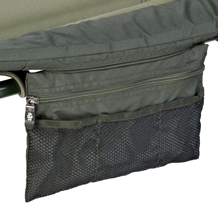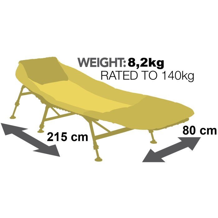 Ultra strong but feather light 6061 Aerospace grade aluminium frame, practical zipped stow pockets on both sides, multi point recliner system, xtra thick padded 600D polyester cover, fully adjustable legs, oversized swivel and fold mud feet, comfortable removable head pillow for a good night sleep.