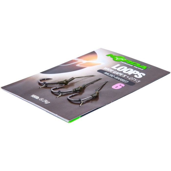 These ready-tied hook link sections are designed to be used in conjunction with our Booms Loop pre-tied booms, or you can tie your own if you prefer. When the two are tied together they form the perfect combi-rig – simply attach the Loops Wide Gape X to the Booms Loop, loop-to-loop style and you are ready to go, and can quickly change the hook section should you need to. The Loops Wide Gape X is set up blow-back style on a Wide Gape X hook, with a perfectly angled piece of shrink tubing over the eye to help ensure that the hook flips over and takes a hold. They are tied using a semi-stiff braided material, and come in barbed or barbless versions, in sizes 4, 6, or 8. You get three in a packet.