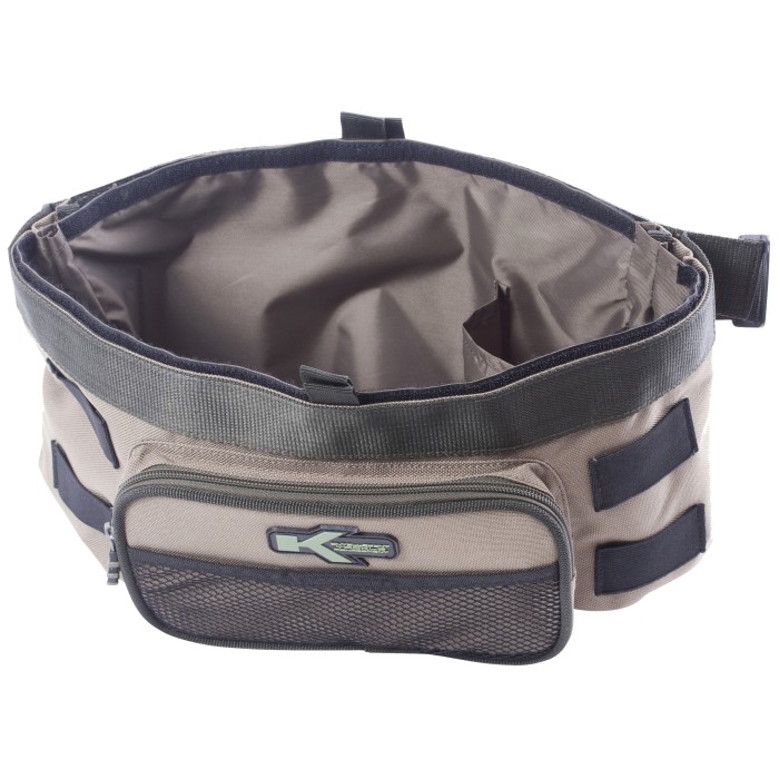 Functional bait pouch that can be used by the roving or trotting angler. Perfect size for your bait and small items of tackle, with removable liner featuring small pocket for sweetcorn tins etc., elasticated sections to keep catapults or throwing sticks and a zipped outer pocket that fits a Korum Multi Accessory Box. Velcro-closing for easy access. Adjustable waistband with strong clip.