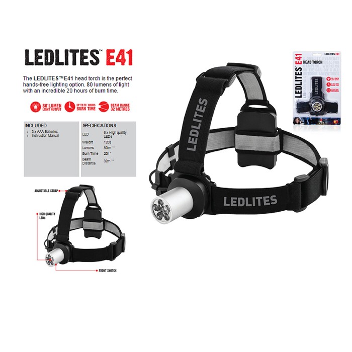 The LEDLITESE41 head torch is the perfect hands-free lighting option. 80 lumens of light with an incredible 20 hours of burn time. Ideal for DIY, Electrician work, walking, running, camping and much more. The headlamp has adjustable elastic straps to fit all head sizes.