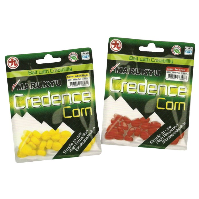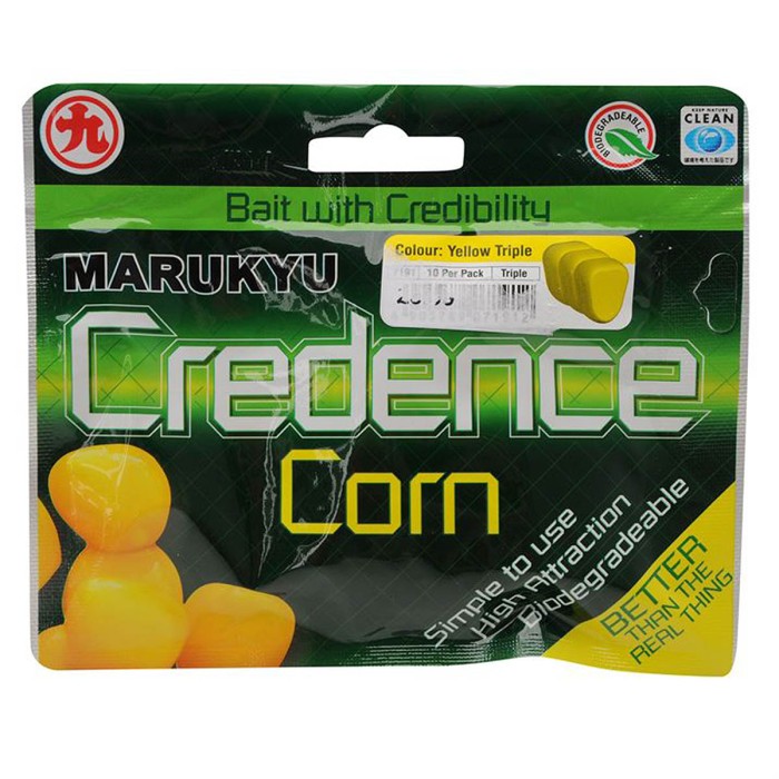 Marukyu Credence Corn, Completely new and patented technology, plastic corn will be a thing of past. Totally environmentally friendly these artificial baits look like plastic but their not. Pack full of amino acids and scent attraction, this high visibility bait will draw fish from a distance. Yet just like plastic baits it's virtually indestructible when small fish peck and pull at it. The advantages to the angler are untold, and no longer do you have the worry of plastic baits causing harm to the fish or environment. If you crack off with plastic that rig is still fishing forever, with credence corn it's not as the bait will break down over a period of time. (approx 48hrs).