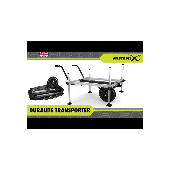 Design based from the Matrix Duralite MKII Platform. Ideal for fishing natural venues or pushing over rough terrain. Metal anchor points for securing your tackle to the barrow and a central bar, which creates an extra strong support when pushing loaded with tackle. A Quick release handle allows large front wheel to be removed effortlessly. The Handles & wheel are easily removed allowing it to be used as a platform. Provided with 4x 36mm legs (700mm long). A Compact design enables the barrow to be quickly packed away. Provided a with main storage bag for the handles, leg and platform. The Wheel is provided in a separate storage bag to isolate dirt from the tyre. Current Duralite platforms cant be converted to take the transport kit.