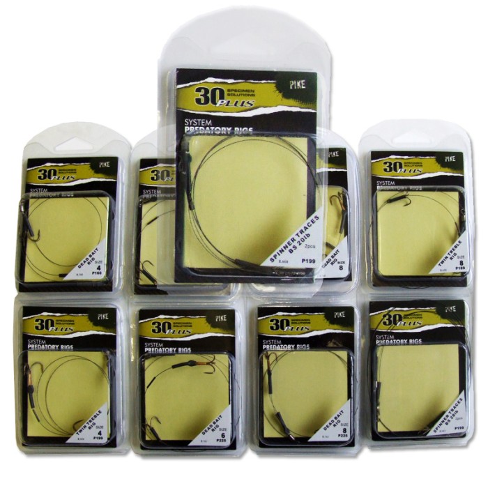 An assortment of Middy 30plus pike traces. The 30plus deadbait rigs have a patented floating crimp which can be fixed or made adjustable. 20lb B/S 20" Semi Barbed and machine crimped. Another great product in the 30plus range.